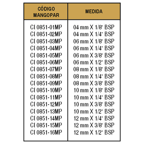 Conector para tubo poliuretano, roscas en pulgadas y tubos en milímetros, sistema engate rapido.